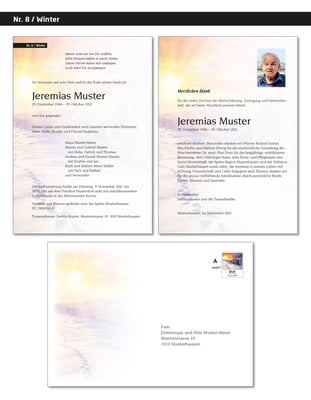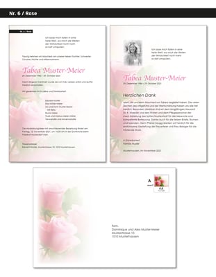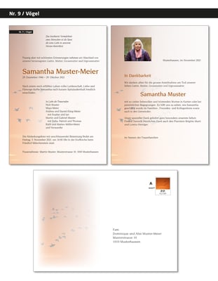 Danksagungskarten im selben Stil eignen sich ideal, um sich bei Verwandten und Bekannten für den Beistand und die Anteilnahme zu bedanken. Auch diese gestalten wir gerne individuell nach Ihren